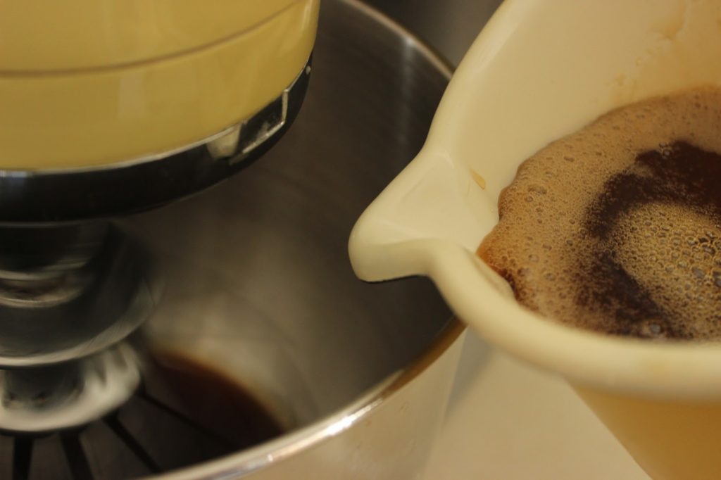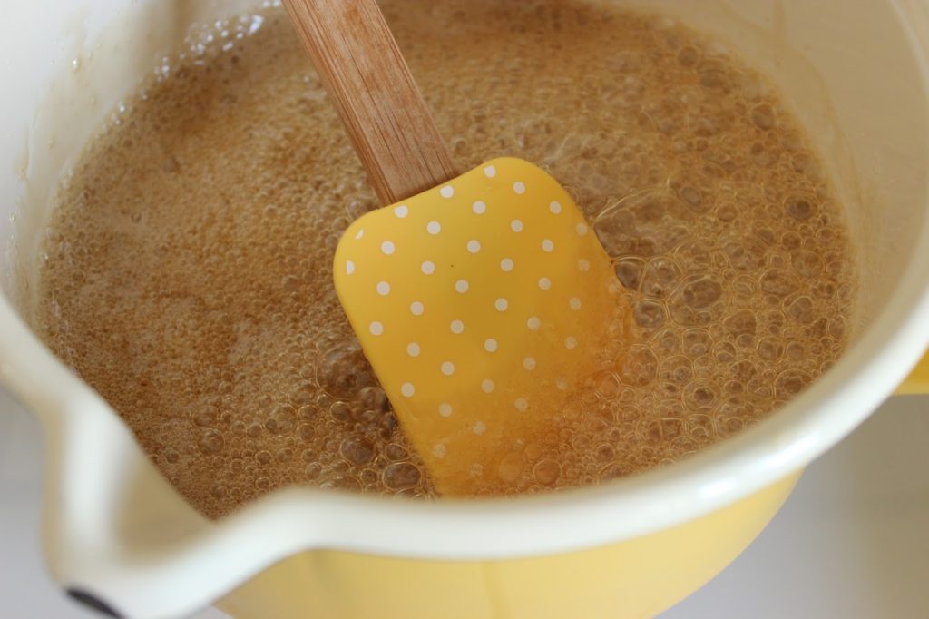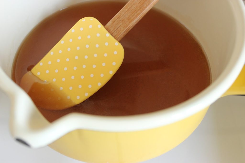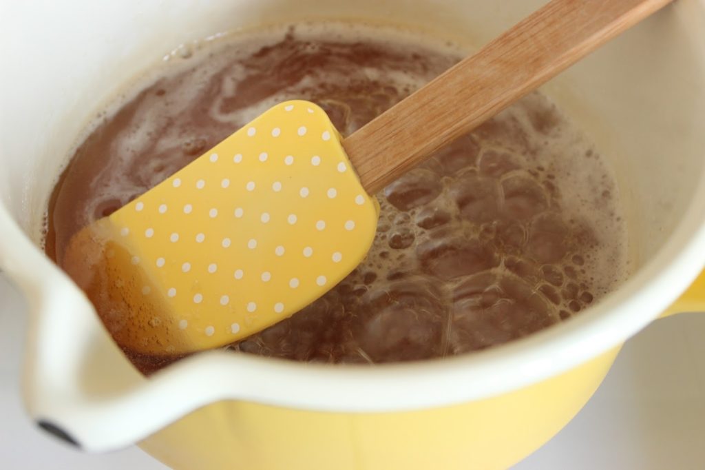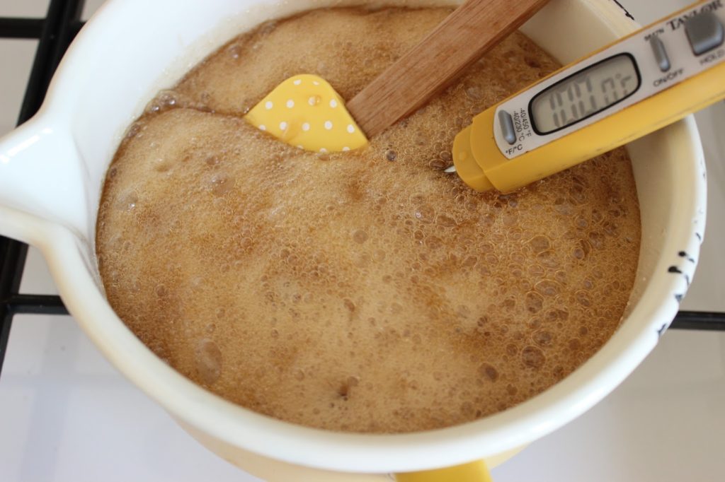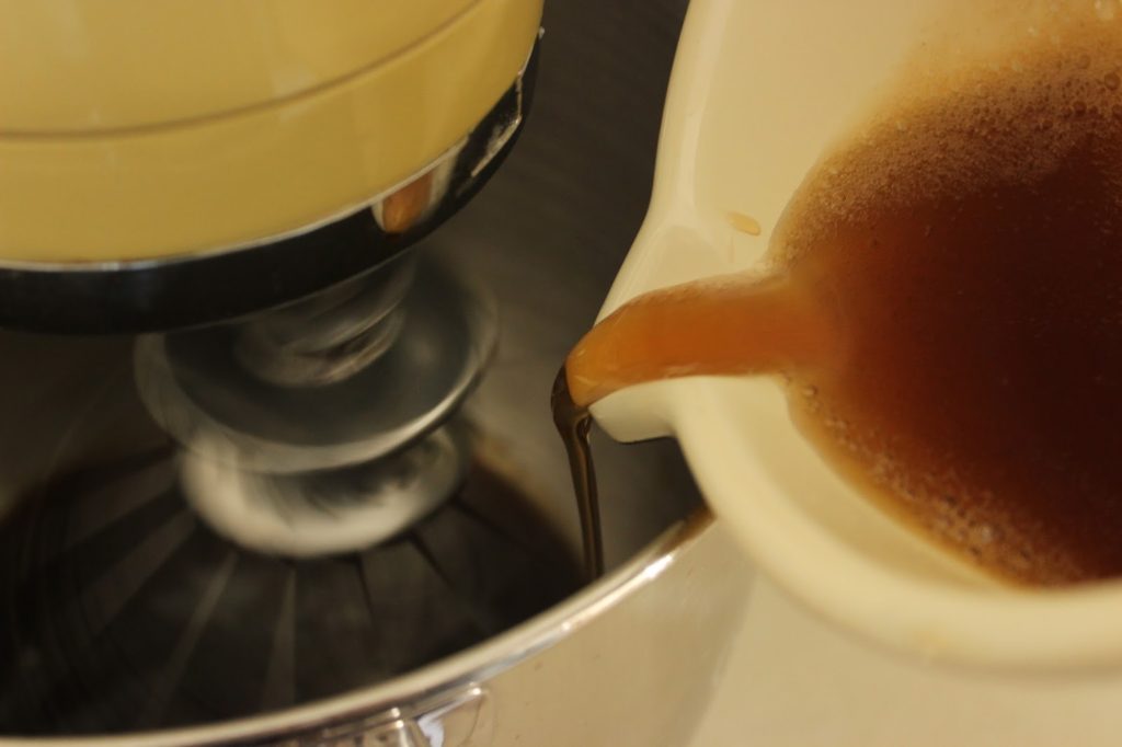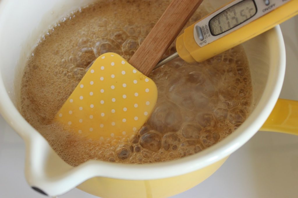 6. כאשר התערובת בסיר מגיעה ל-116 מעלות, מסירים מהאש ויוצקים לתוך הקערה בזרם איטי, תוך כדי פעולת המיקסר.