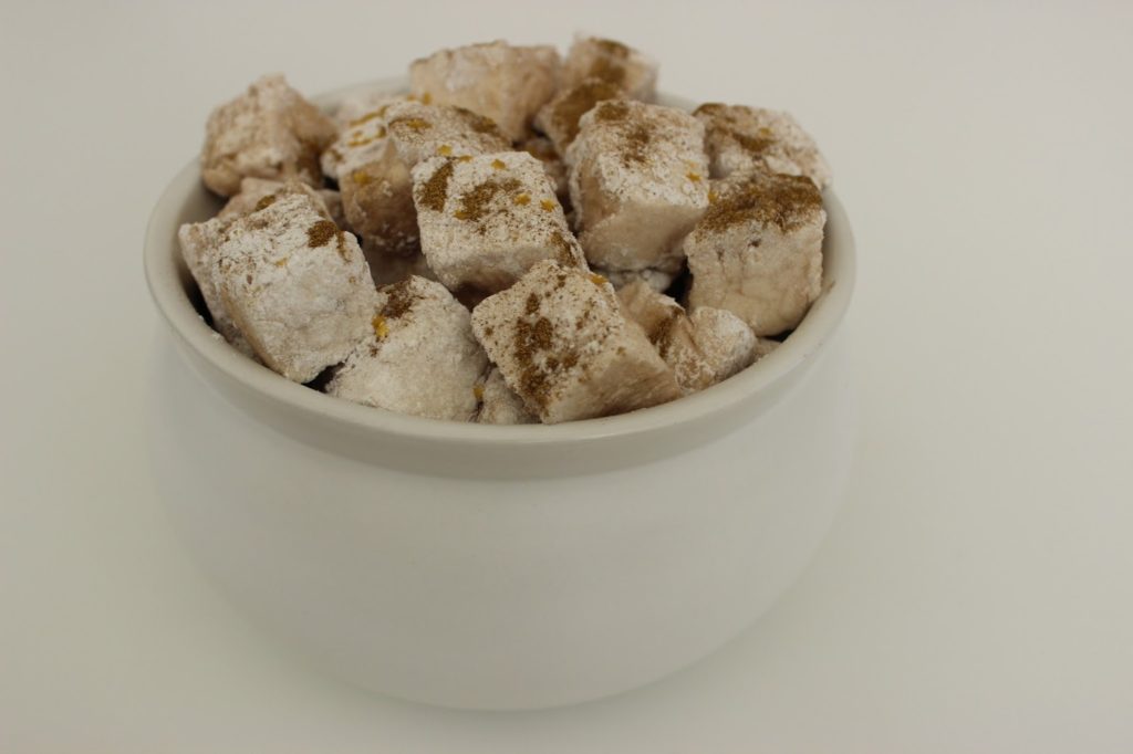 13. מחלצים את המרשמלו המוכן מהתבנית (אפשר להפריד מהדפנות בעזרת פלטה קטנה או סכין). הופכים את הגוש כך שחלקו התחתון, הלא מצופה, מופנה כלפי מעלה. זורים מעליו שכבה של ציפוי קורנפלור ואבקת סוכר.
