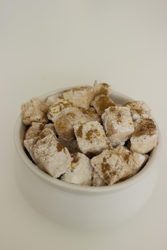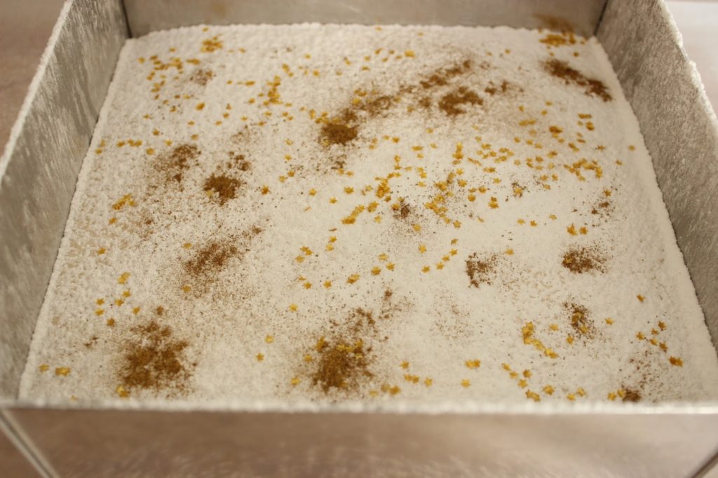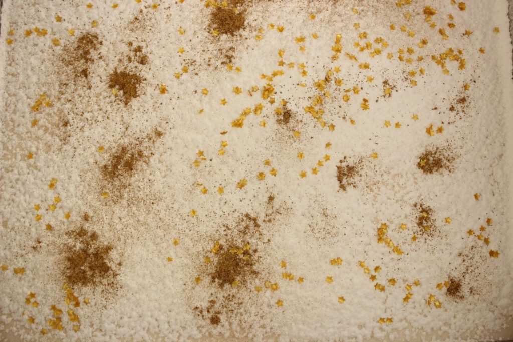 11. בעזרת מסננת קטנה, מפזרים שכבה אחידה של ציפוי מעל פני המרשמלו.