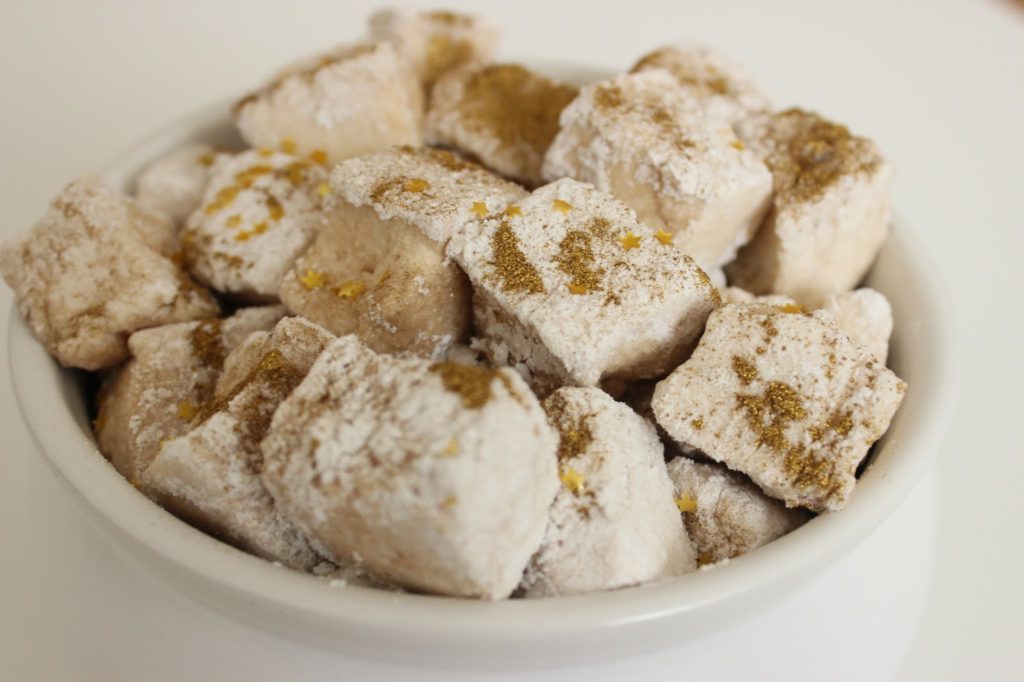 - אני הוספתי אבקת זהב וכוכבי זהב קטנים לציפוי שלי (ופיזרתי גם קצת מלמעלה, מעל קוביות המרשמלו המוכנות), אבל זה ממש לא חובה.