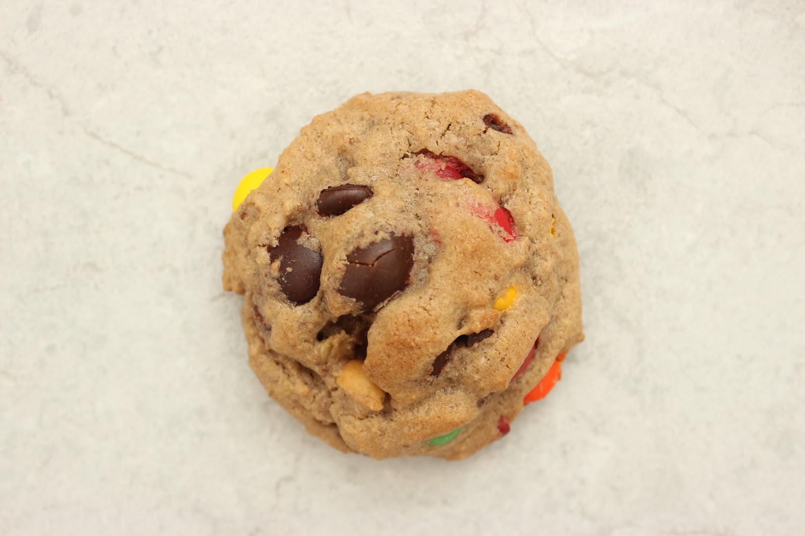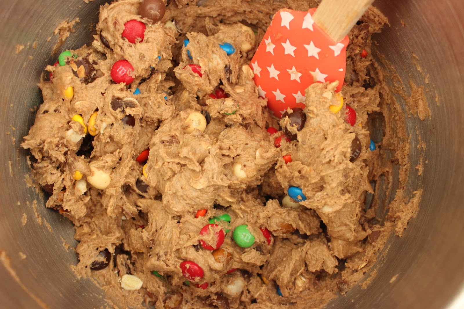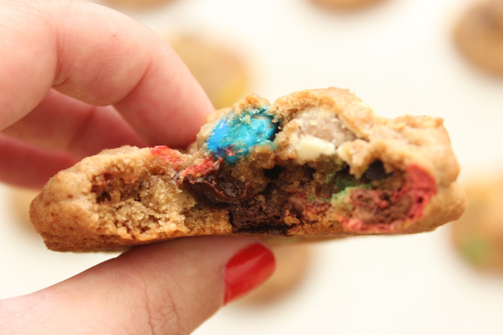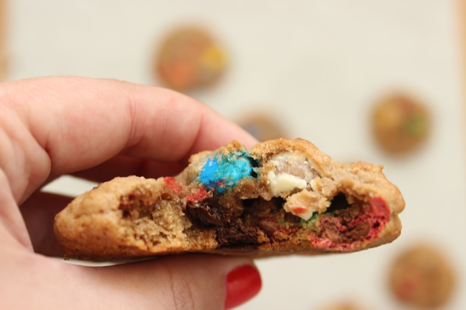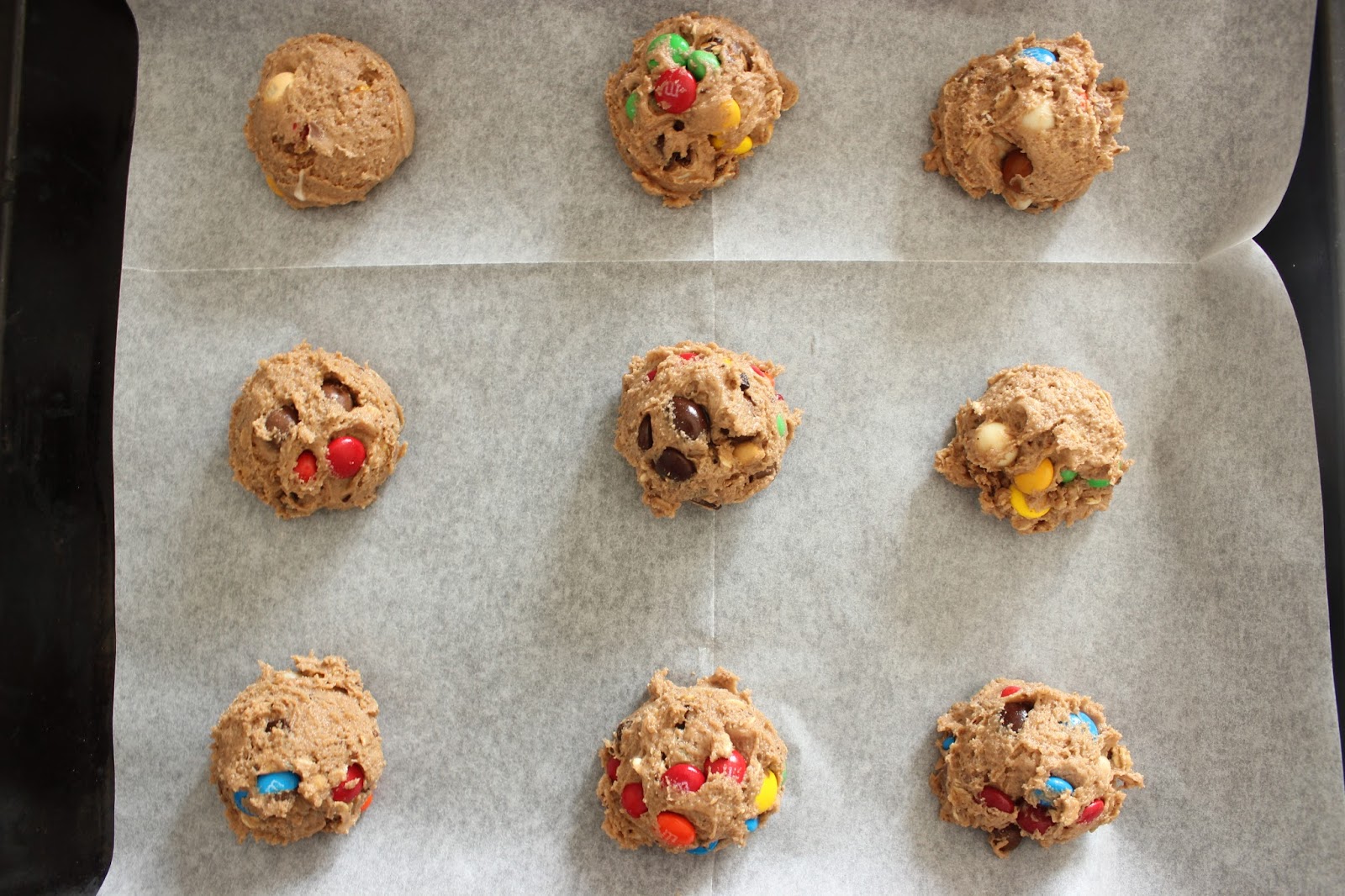 • אז לגבי התוספות. בגדול, הכל הולך. אני השתמשתי במיקס של מספר סוגי M&M’s, מיני ריסז קאפס, שוקולדים קטנים של הרסי, שוקולד צ’יפס, קליק קצוצים ואולי עוד דברים, שכבר הספקתי לשכוח. באמת שהעוגיות האלה מקבלות באהבה כל מה שתוסיפו להן.
