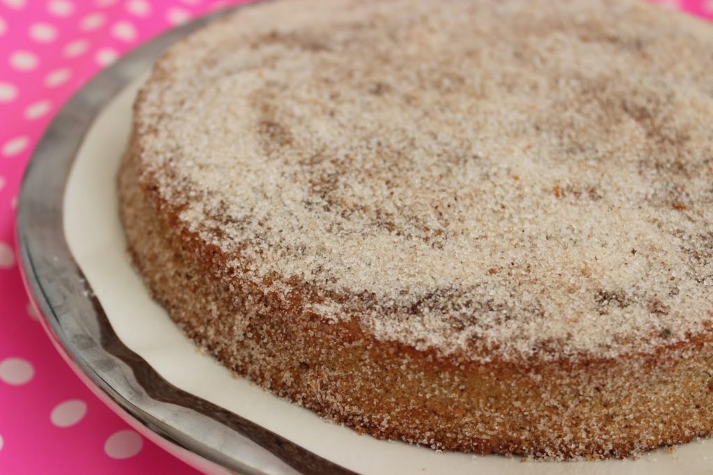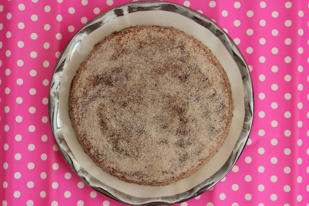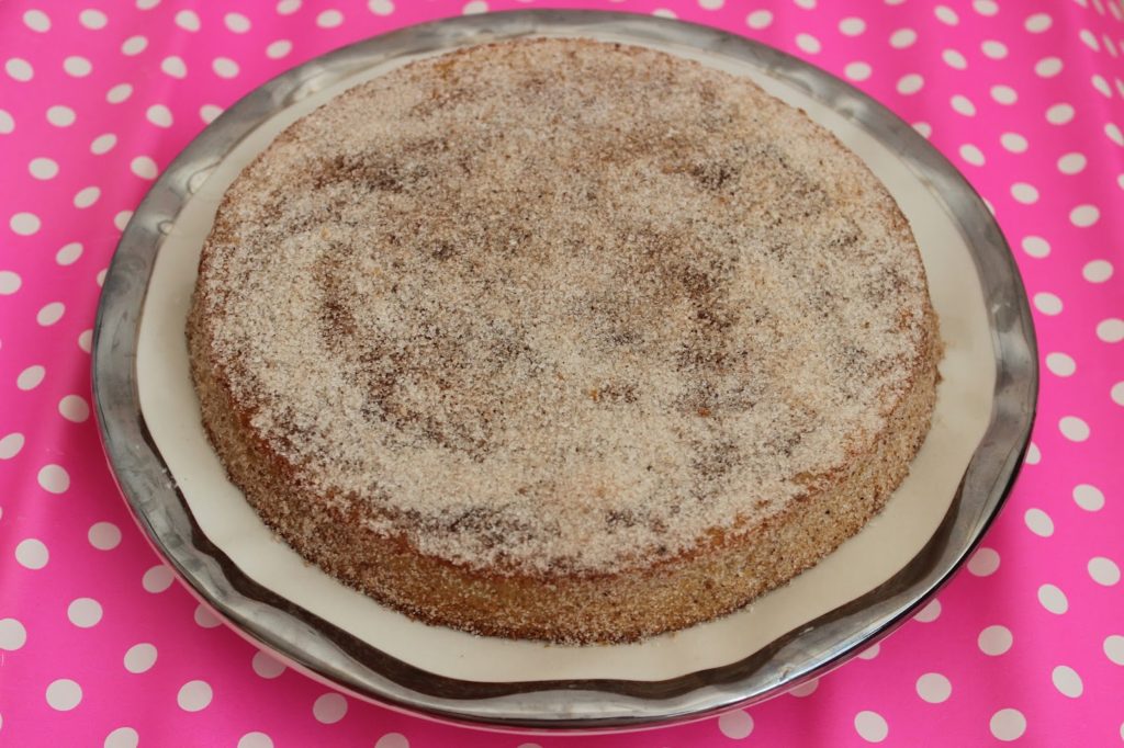 8. מערבבים סוכר וקינמון ומניחים בצלחת הגדולה מקוטר העוגה (או בתבנית גדולה). מעמידים את העוגה על צדה ומגלגלים בסוכר הקינמון, כך שהדפנות כולן מצופות.