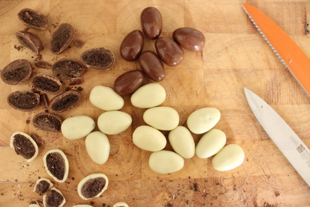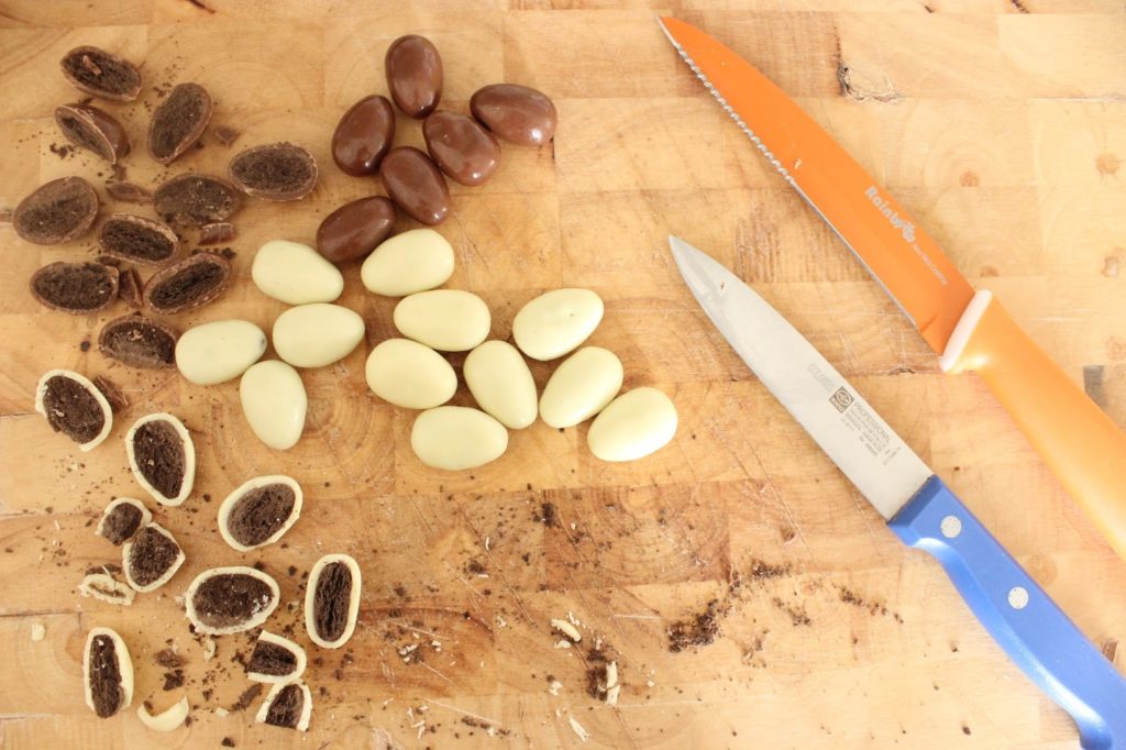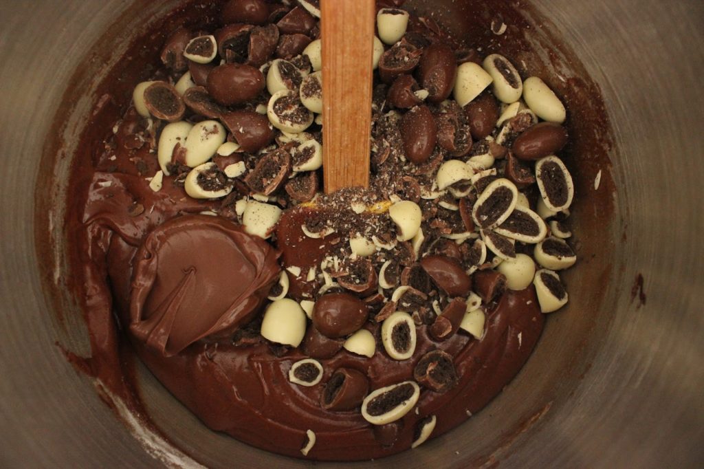 6. קוצצים קליק באופן גס (לא חובה, אפשר גם להשאיר אותם שלמים). מוסיפים לקערת המיקסר יחד עם ממרח הקליק ומקפלים פנימה, עד לפיזור אחיד.