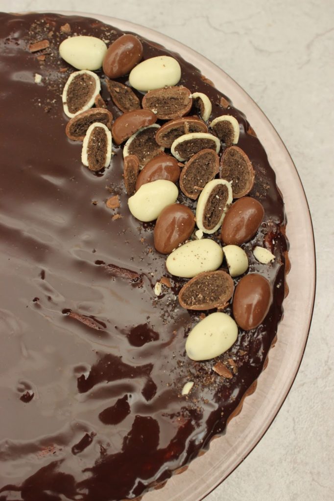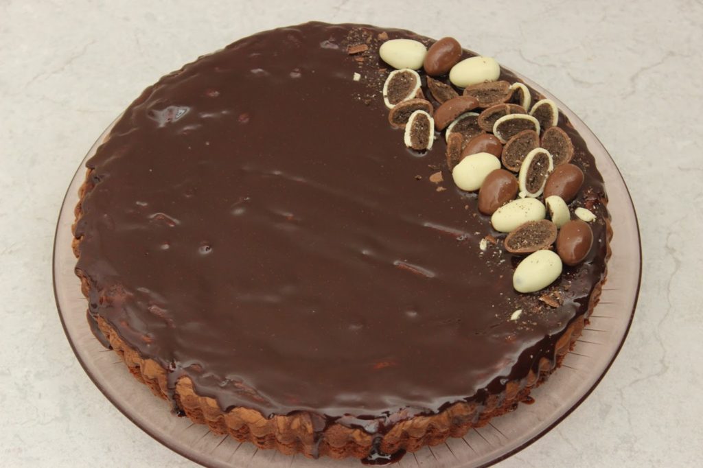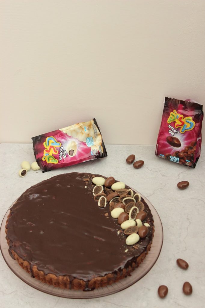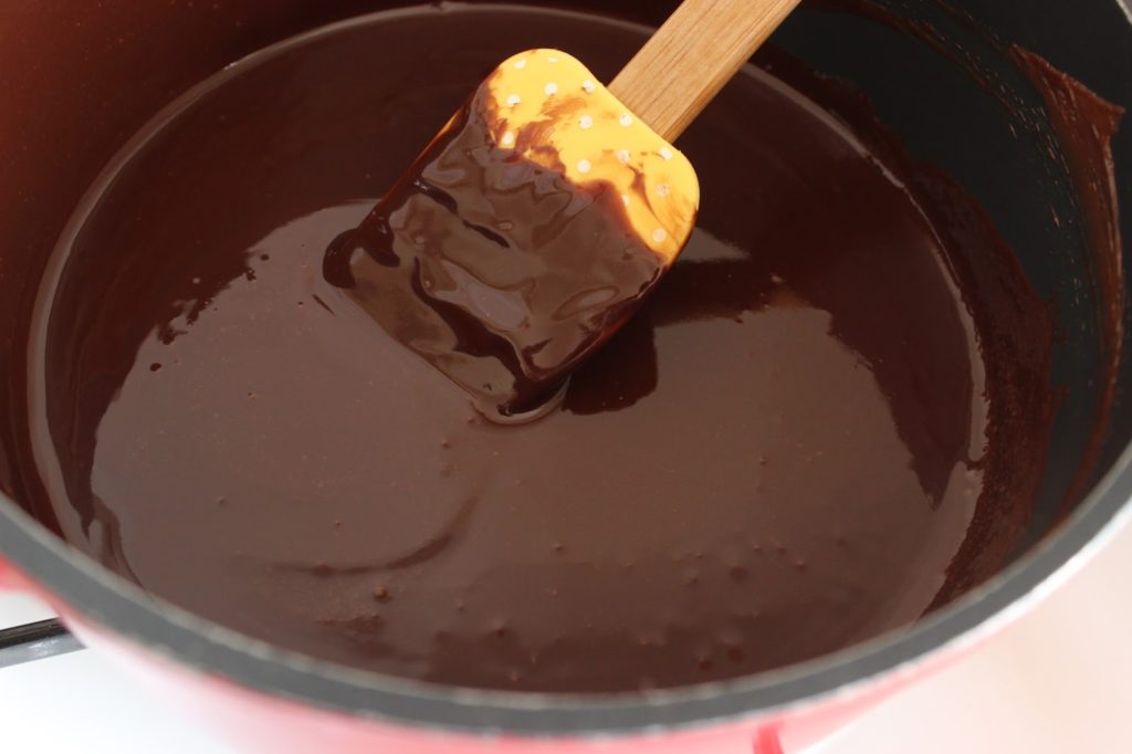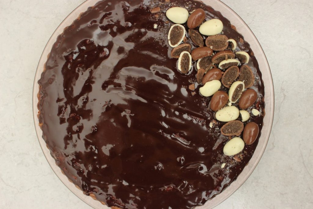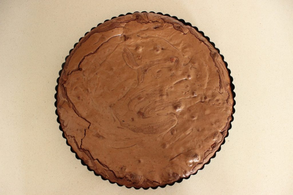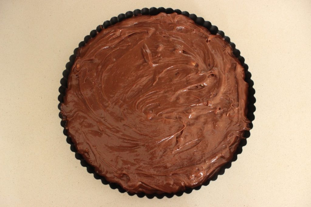 10. יוצקים את הגנאש מעל הפאי, כך שהוא מכסה את כל חלקו העליון. אם צריך, עוזרים לקרם לצפות את כל פני הבראוניז בעזרת לקקן.