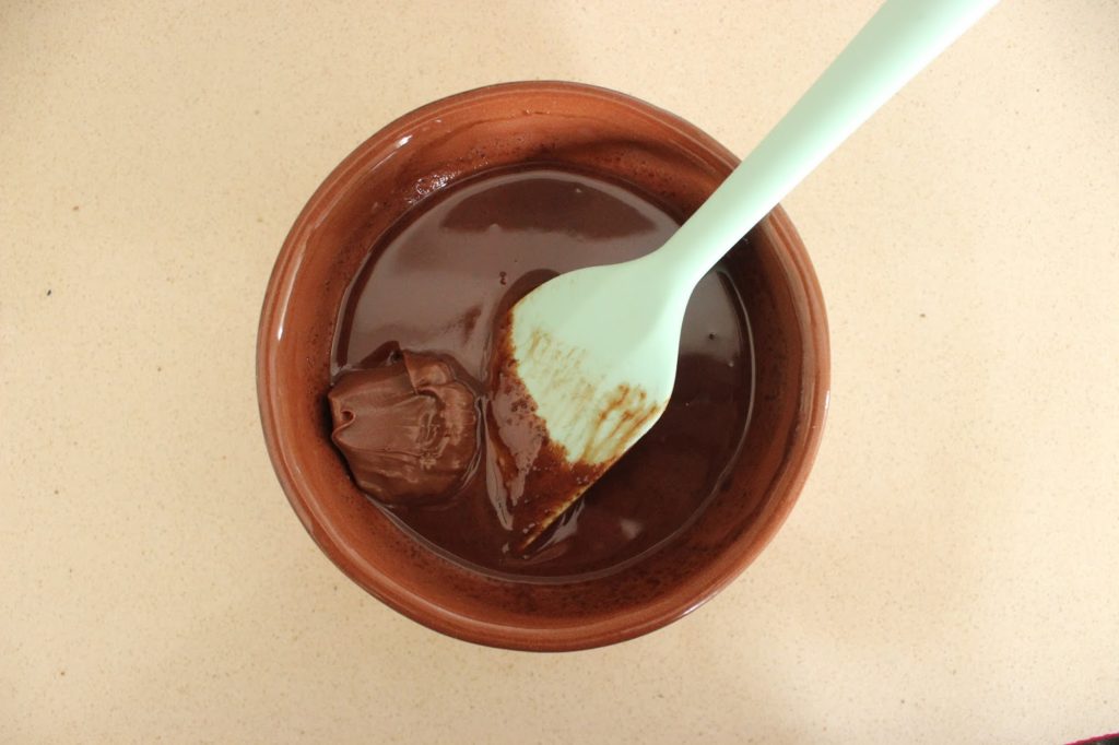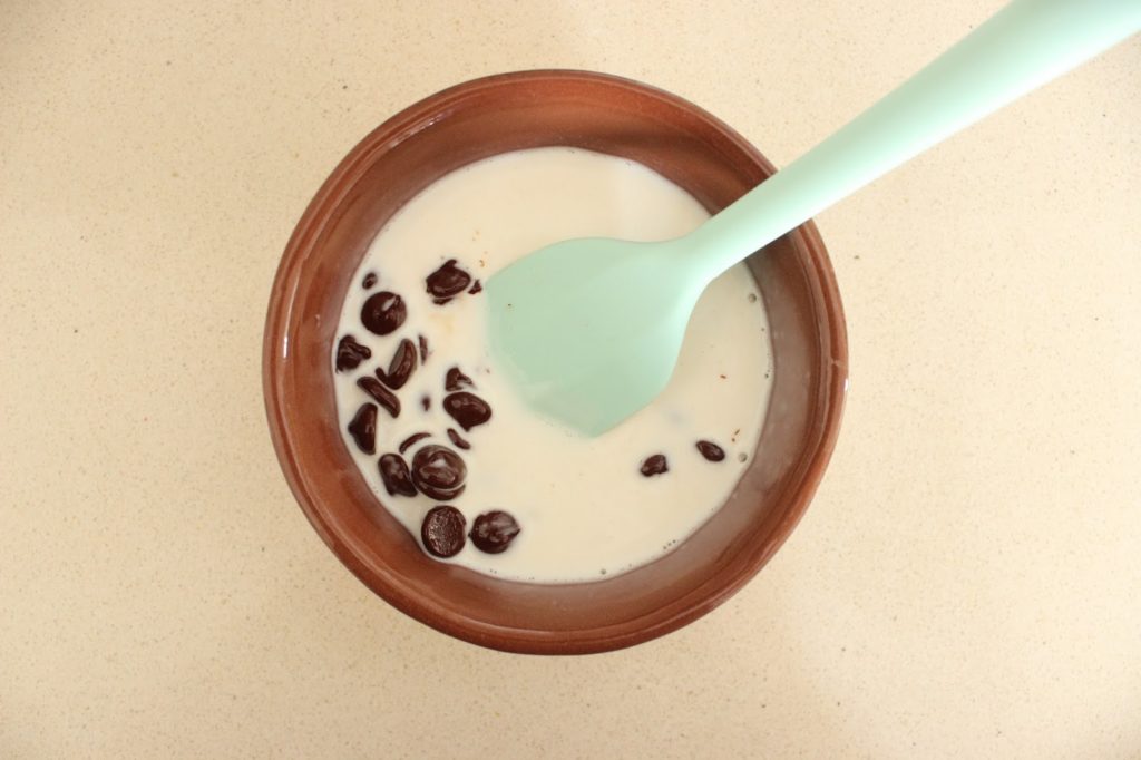 8. להכנת הגנאש: מניחים שמנת מתוקה ושוקולד מריר בקערה קטנה. מחממים במיקרוגל בפולסים של 15-30 שניות, ומערבבים עם לקקן קטן בין לבין, עד לקבלת קרם חלק.