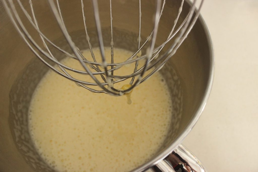 3. מניחים ביצים וסוכר בקערת המיקסר. מחברים וו בלון ומקציפים היטב, שלוש-ארבע דקות, עד לקבלת קצף בהיר ותפוח.