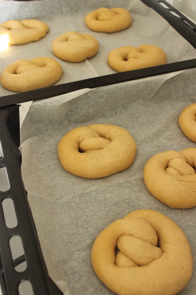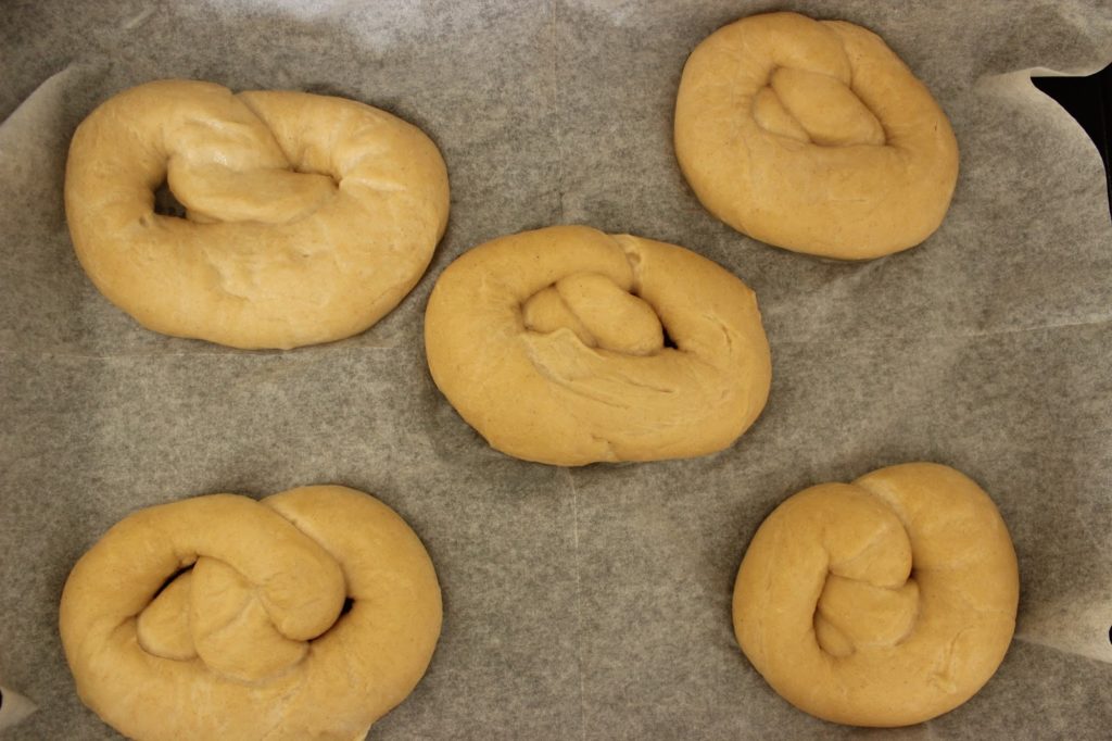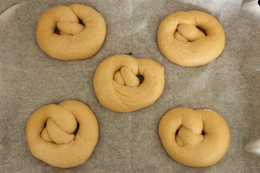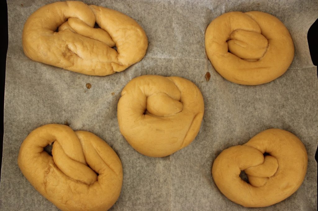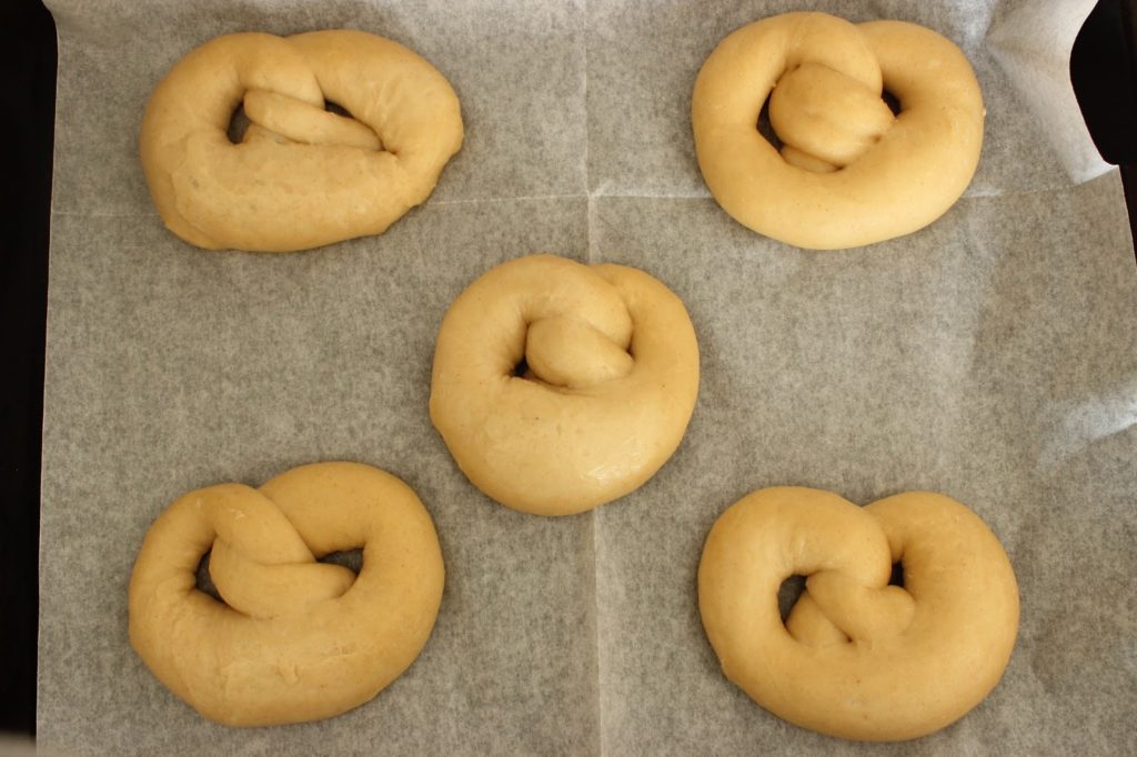7. מחלקים את הבצק לעשרה כדורים שווי גודל, פחות או יותר. יוצרים נחש ארוך ודק מכל כדור בצק ויוצרים פרעצל. מניחים בתבנית מרופדת בנייר אפיה, כאשר שומרים על מרווח של מספר סנטימטרים בין פרעצל לפרעצל.