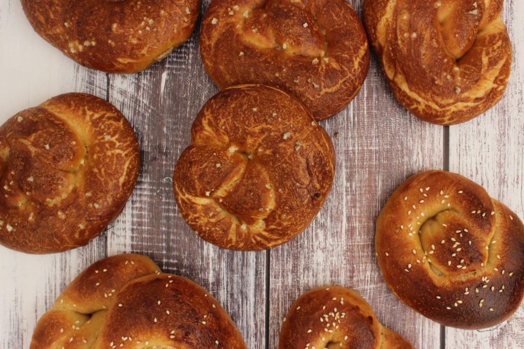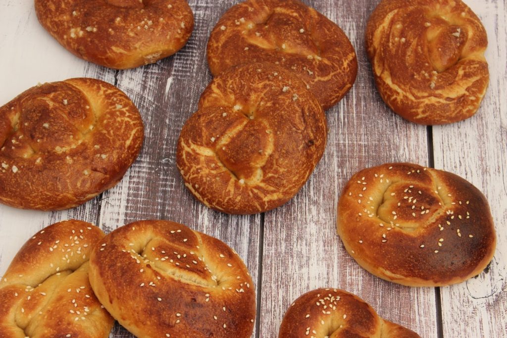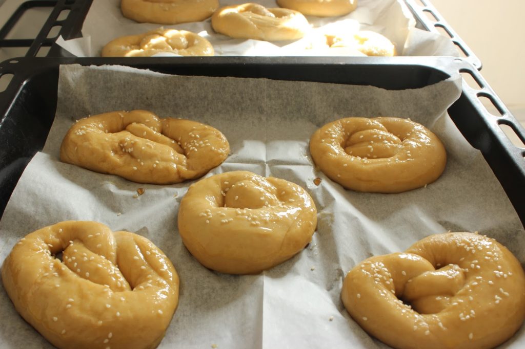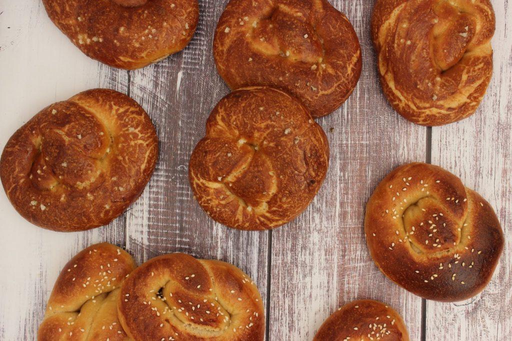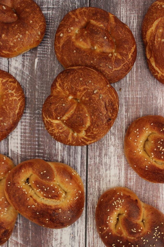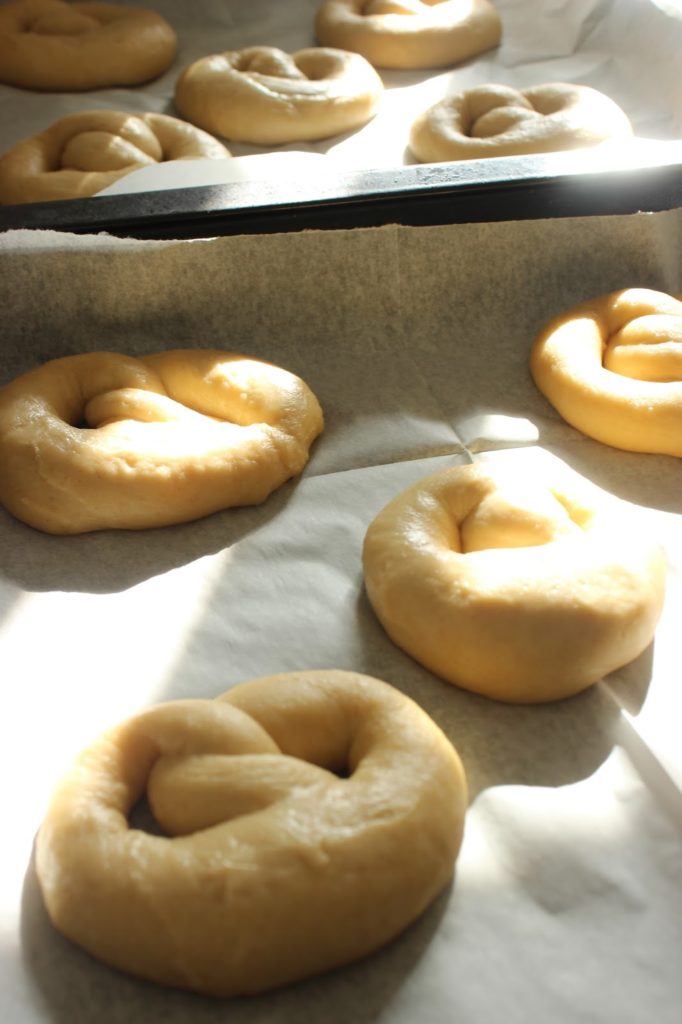 7. מחלקים את הבצק לעשרה כדורים שווי גודל, פחות או יותר. יוצרים נחש ארוך ודק מכל כדור בצק ויוצרים פרעצל. מניחים בתבנית מרופדת בנייר אפיה, כאשר שומרים על מרווח של מספר סנטימטרים בין פרעצל לפרעצל.