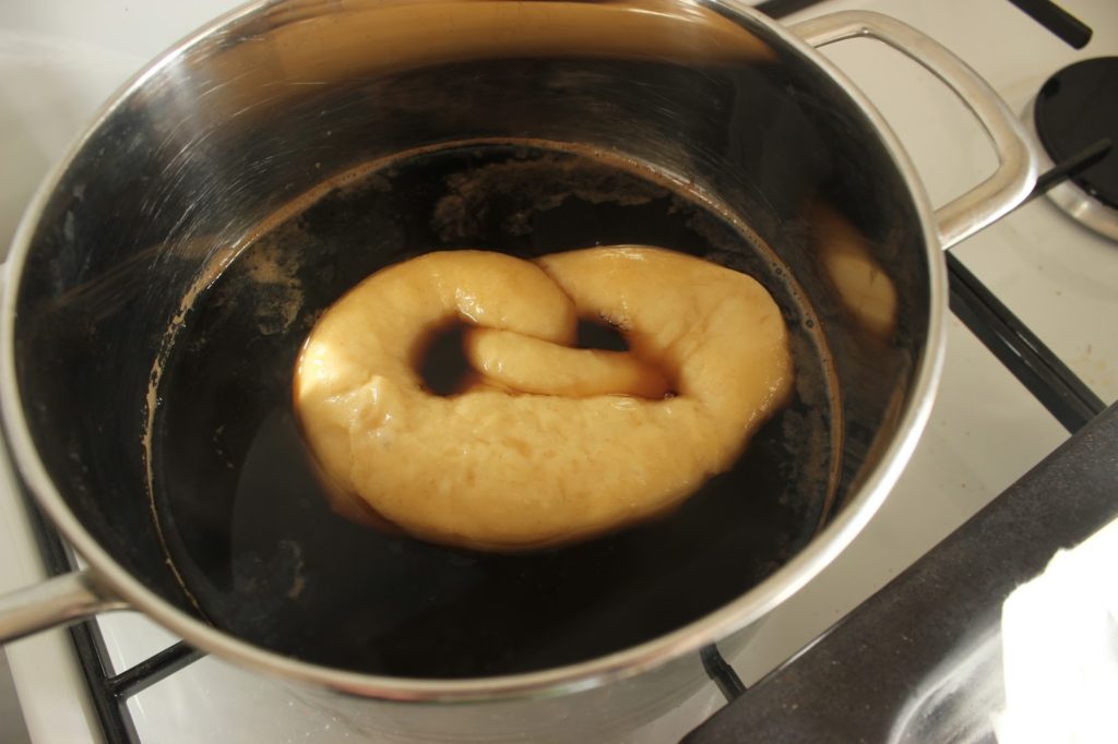 11. טובלים חצי מהפרעצלים בתערובת המלוחה: מעבירים פרעצל לסיר, ממתינים 10-15 שניות, הופכים לצד השני, ממתינים שוב 10-15 שניות, ומוציאים בעזרת כף מחוררת. מחזירים לתבנית.
