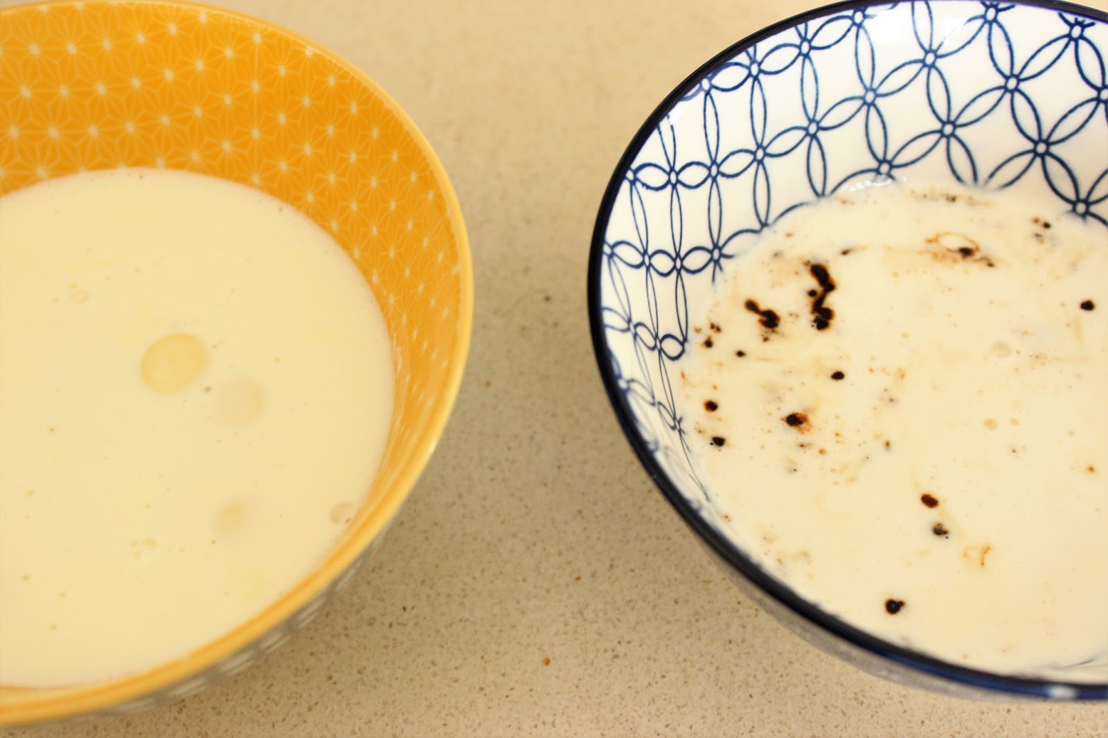 3. כאשר השמנת מתחילה לרתוח, יוצקים חצי ממנה לתוך כל קערת שוקולד. ממתינים שתיים-שלוש דקות ומערבבים כל קערה לגנאש חלק ואחיד. מניחים את שתי הקערות בצד.