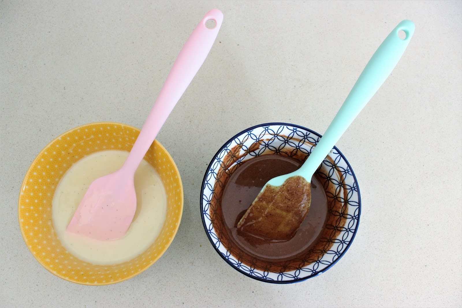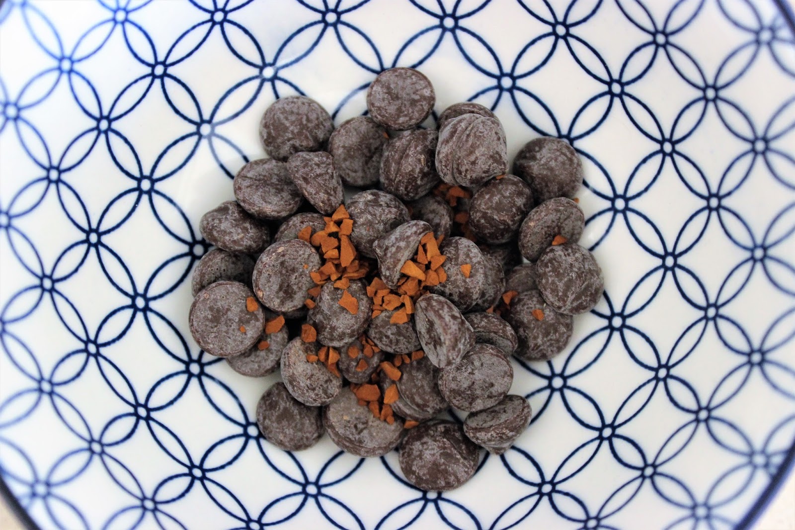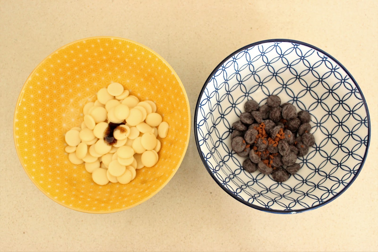 2. בינתיים מניחים שוקולד מריר ואבקת נס קפה בקערה בינונית אחת, ושוקולד לבן ווניל בקערה בינונית שניה.