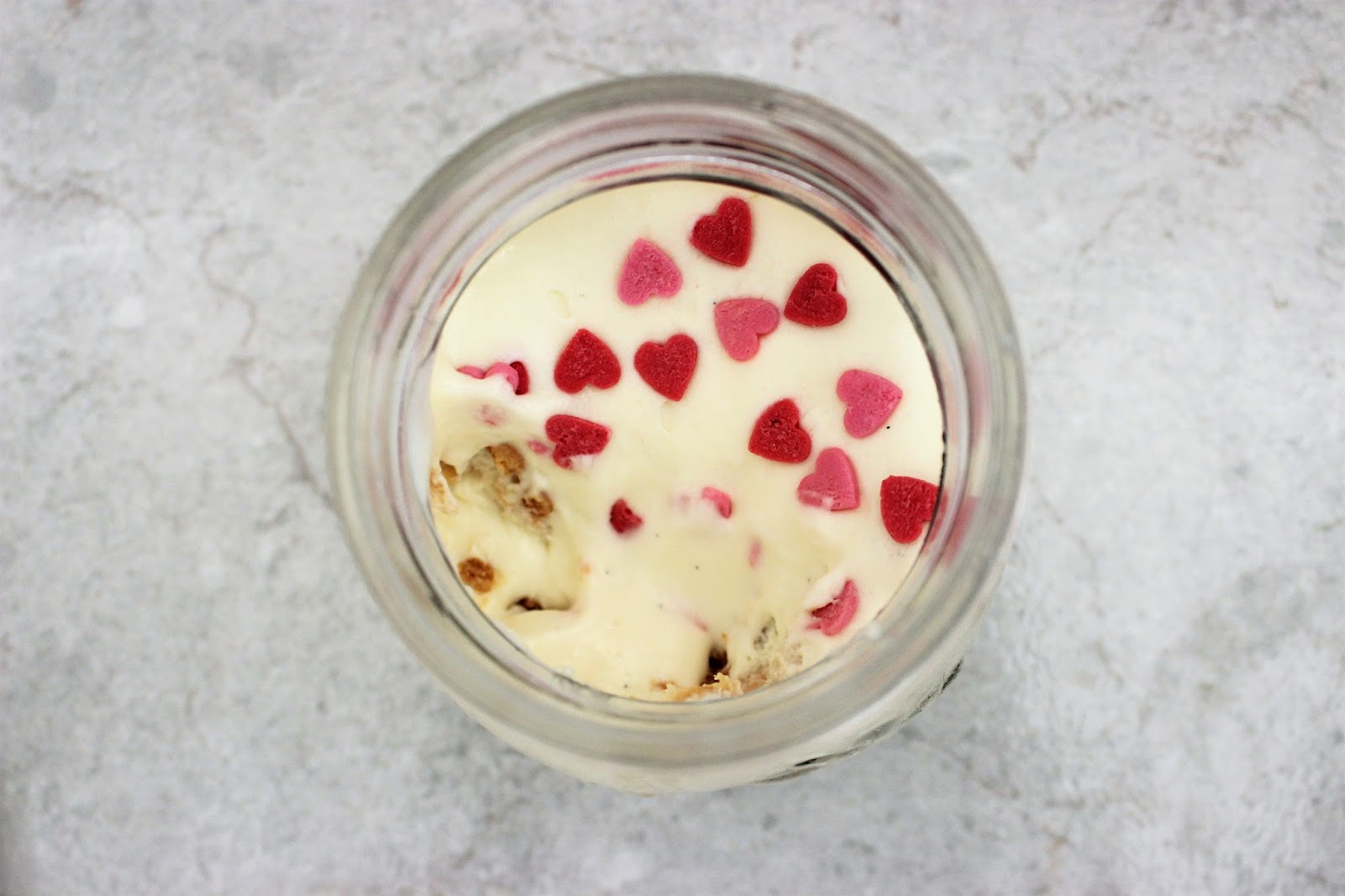 בצנצנת השניה: שכבות של מוס שוקולד לבן ווניל עם שברי פתי בר וניל.